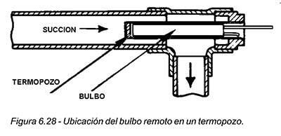 En realidad, más importante que la ubicación física del bulbo alrededor de la tubería es el contacto térmico entre el bulbo y la línea de succión; así como el diseño de la tubería de succión. Asegúrese de fijar bien las abrazaderas, de modo que el bulbo remoto haga buen contacto con la línea de succión, sin apretar en exceso para no dañar el bulbo. Nunca se debe instalar el bulbo en la parte inferior de la línea de succión; es decir, a las 6 en punto del reloj, porque en esta ubicación puede sentir la temperatura del aceite, el cual fluye por el fondo de la línea horizontal y su temperatura puede ser diferente que la del gas, lo que ocasionará que la válvula opere erráticamente. Si el bulbo se coloca fuera del espacio refrigerado, se requiere protección adicional de la temperatura ambiente. Si es necesario proteger al bulbo remoto del efecto de una corriente de aire, después de fijarlo con las abrazaderas en la línea, utilice un material aislante que no absorba agua con temperaturas del evaporador arriba de 0°C. Para temperaturas menores de 0°C, se sugiere emplear corcho o algún material similar sellante contra la humedad, para prevenir la acumulación del hielo en la ubicación del bulbo. No se recomienda el uso de fieltro. Cuando el bulbo se vaya a ubicar bajo el nivel de agua o salmuera en un serpentín sumergido, utilice un material a prueba de agua que no requiera calentarse arriba de 50°C al aplicarlo, esto para proteger el bulbo remoto y el tubo del bulbo. Nunca aplique calor cerca de la ubicación del bulbo sin antes retirarlo.