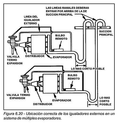 Debe asegurarse también que el tramo de la línea de succión donde va ubicado el bulbo, tenga una ligera pendiente para que haya un libre drenaje. De la misma manera, el bulbo no debe ubicarse donde exista una trampa en la línea de succión. Si el evaporador o varios evaporadores están instalados en un nivel más alto que el compresor, existen dos maneras de hacer el arreglo de la tubería, como se muestra en la figura 6.26. Si el sistema cuenta con un control de vaciado del evaporador por medio del uso de una válvula solenoide (pump down), se puede conectar la línea de succión directamente abajo del compresor, sin la trampa. Si no se cuenta con el control de vaciado, la línea de succión deberá tener una trampa después del bulbo, antes de subir verticalmente a otra trampa invertida, aproximadamente a la misma altura del evaporador. Esto es con el objeto de evitar que el refrigerante o el aceite drenen hacia el compresor por gravedad durante los ciclos de paro. Esto no evita que durante los ciclos de paro el refrigerante abandone el evaporador y se condense en el compresor, si éste o la línea de succión están a más baja temperatura.