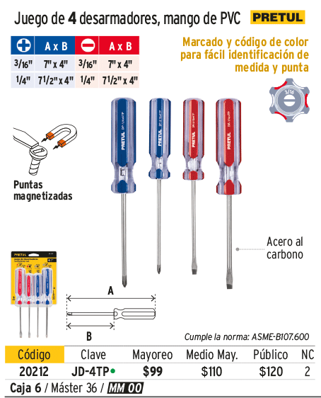 Juego de 4 desarmadores mango de PVC, Pretul - 20212 - JD-4TP - Caja con 6 Set – Master 36